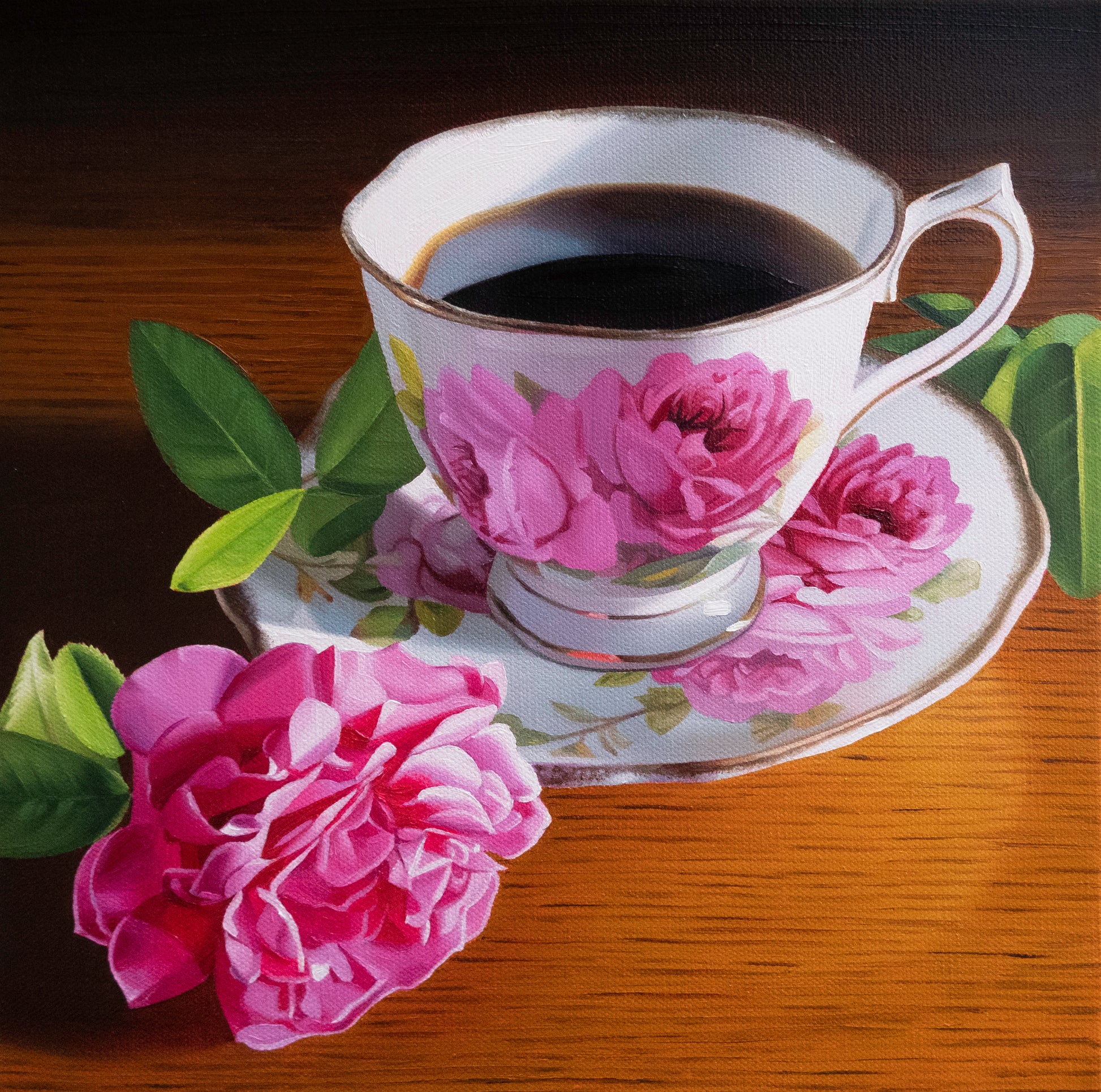 A warm still life featuring a floral teacup and a garden rose.