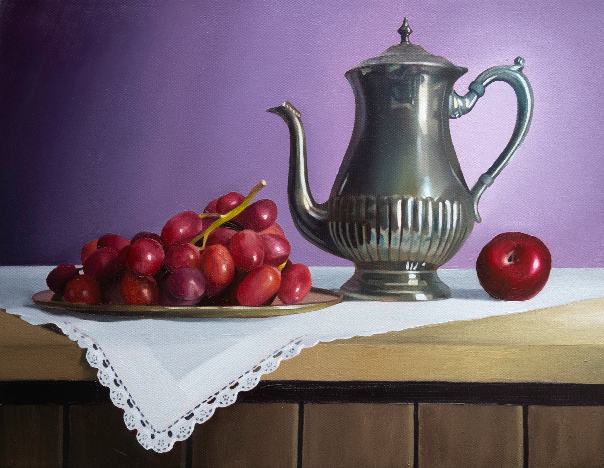 A tarnished silver teapot, red grapes, and a plum.